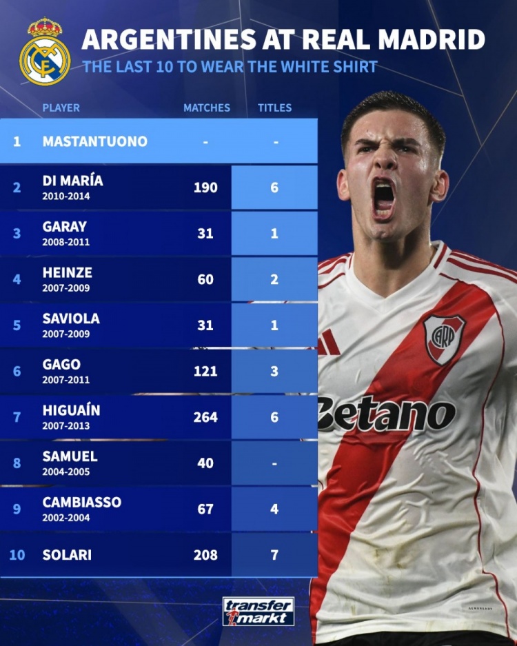 8月15日,皇家马德里迎来新援马斯坦托诺的加盟仪式,这位阿根廷中场正式开启伯纳乌生涯。德国转会市场借此回顾了近十年效力皇马的阿根廷球员数据,统计了他们的出场次数和冠军荣誉。